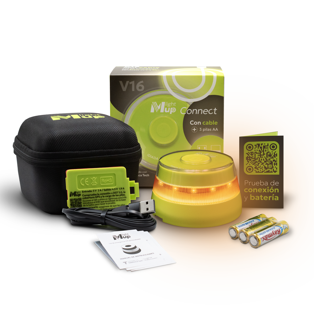 V16 kit con cable de emergencia y pilas: incluye una baliza V16 con funda protectora antigolpes con cremallera, las 3 pilas LR6 (AA), el manual de instrucciones, una tarjeta para comprobar la conexión de la luz con la DGT, el estado de las pilas y la cobertura de forma anónima.